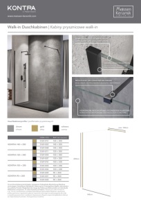 Walk-in Duschkabinen | Kabiny prysznicowe walk-in CODE / KOD: B×H / szer.×wys.[cm]: KONTRA 140 × 200 S169-012 140 × 200 S169-002 140 × 200 S169-008 140 × 200 KONTRA 120 × 200 S169-011 120 × 200 S169-004 120 × 200 S169-007 120 × 200 KONTRA 100 × 200 S169-010 100 × 200 S169-003 100 × 200 S169-006 100 × 200 KONTRA 90 × 200 S169-009 90 × 200 S169-001 90 × 200 S169-005 90 × 200 10 mm Einscheibensicherheitsglas, transparent; Hydrophobe Beschichtung (KlarZone technologie), Verstellbares Wandprofil, Halterung mit 2 beweglichen Köpfen, behindertenfreundliches Produkt, Möglichkeit die Länge der Halterung (Kabinentiefe) auf individuelle Bedürfnisse anzupassen, 10 Jahre Garantie auf Kabine / bezpieczne szkło hartowane o gr. 10 mm, transparentne, powłoka hydrofobowa (technologia KlarZone), regulowany profil przyścienny, regulowane głowice wspornika ściennego, produkt przyjazny dla osób z niepełnosprawnościami, możliwość dopasowania długości wspornika (głębokości kabiny) do indywidualnych potrzeb, 10 lat gwarancji na kabinę VERSTELLBARES WANDPROFIL REGULOWANY PROFIL PRZYŚCIENNY KABINY 140cm max. 120cm 200cm chrom chrom gold złoty schwarz czarny Duschkabinenprofile / profile kabin prysznicowych: 10 MM GEHÄRTETES SICHERHEITSGLAS HYDROPHOBE BESCHICHTUNG TECHNOLOGIE KLARZONE) 10 MM BEZPIECZNE SZKŁO HARTOWANE POWŁOKA HYDROFOBOWA (TECHNOLOGIA KLARZONE) 10 MM GEHÄRTETES SICHERHEITSGLAS HYDROPHOBE BESCHICHTUNG TECHNOLOGIE KLARZONE) 10 MM BEZPIECZNE SZKŁO HARTOWANE POWŁOKA HYDROFOBOWA (TECHNOLOGIA KLARZONE) 10 MM GEHÄRTETES SICHERHEITSGLAS HYDROPHOBE BESCHICHTUNG TECHNOLOGIE KLARZONE) 10 MM BEZPIECZNE SZKŁO HARTOWANE POWŁOKA HYDROFOBOWA (TECHNOLOGIA KLARZONE) HYDROPHOBE BESCHICHTUNG (TECHNOLOGIE KLARZONE) POWŁOKA HYDROFOBOWA (TECHNOLOGIA KLARZONE) MÖGLICHKEIT DIE LÄNGE DER HALTERUNG MOŻLIWOŚĆ DOPASOWANIA DŁUGOŚCI WSPORNIKA www.meissen-keramik.com 10 MM GEHÄRTETES SICHERHEITSGLAS 10 MM BEZPIECZNE SZKŁO HARTOWANE